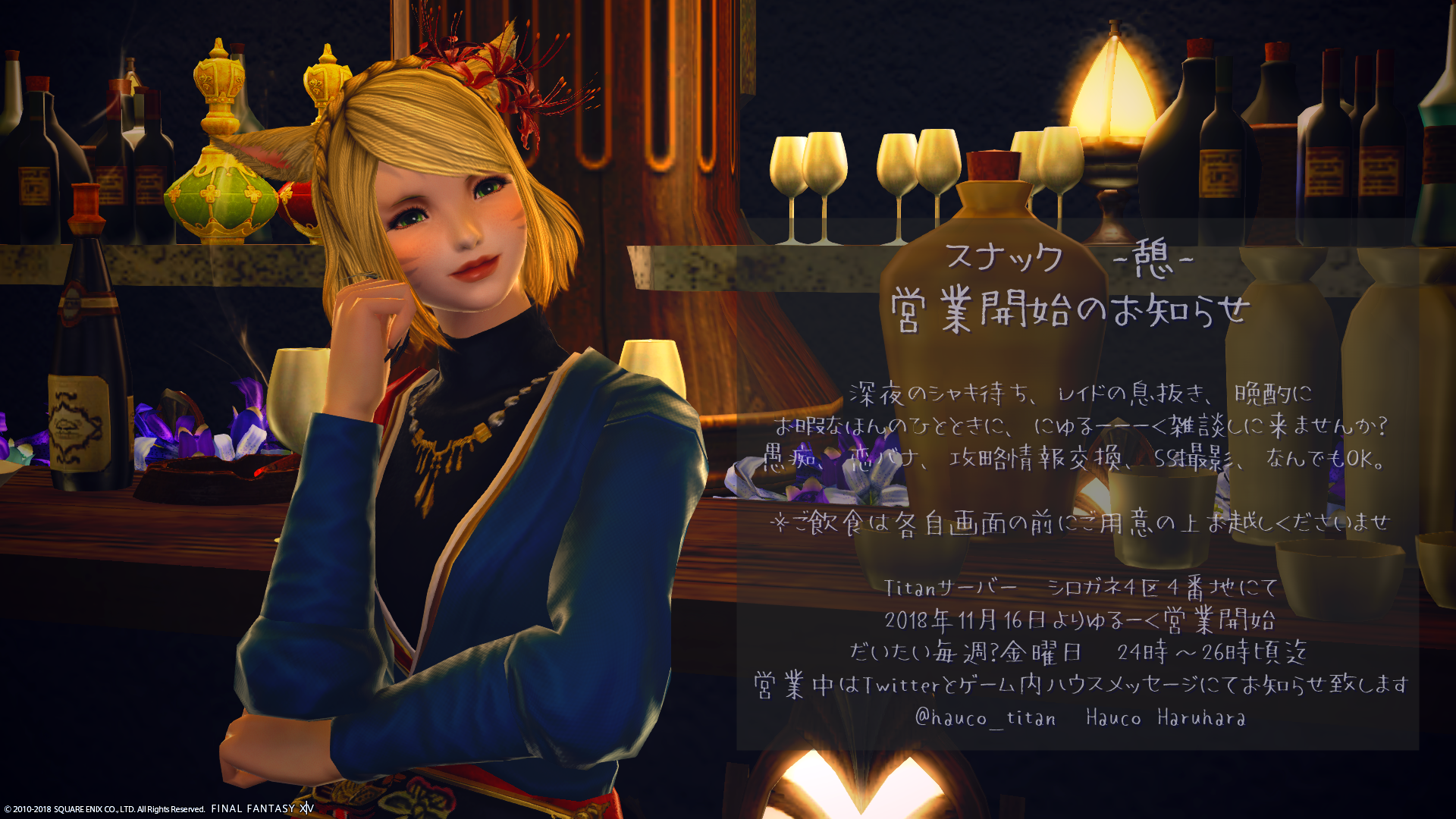 当ブログは私、haucoが毎日のようにプレイしているFF14での出来事をなんとなく箇条書きにしてみたり、Twitterに載せるために編集したSSなどを保管していくために作ったゆるいブログです。